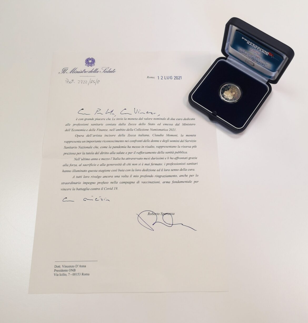 Il presidente dell’Ordine Nazionale dei Biologi, Vincenzo D’Anna, ha ricevuto dal Ministro della Salute, Roberto Speranza, la moneta del valore nominale di due euro dedicata alle professioni sanitarie, coniata dalla Zecca dello Stato.
