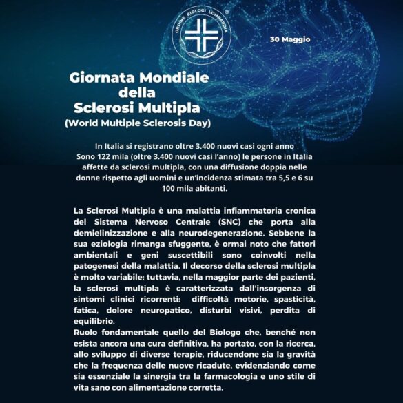 Oggi, martedì 30 maggio, ricorre la giornata mondiale della Sclerosi multipla. Un giorno in cui la comunità globale si mobilita per sensibilizzare su una patologia cronica tra le più comuni e più gravi del sistema nervoso centrale, che solo in Italia, colpisce 133 mila persone con una diffusione doppia nelle donne rispetto agli uomini. La sclerosi è anche la prima causa di disabilità neurologica nei giovani adulti, con l’esordio tipico intorno ai 30 anni. Un ruolo fondamentale, per quanto concerne la lotta a questa malattia, riveste anche il Biologo, il quale, benché non esista, allo stato, ancora una cura definitiva, ha portato, con la ricerca, allo sviluppo di diverse terapie, riducendone sia la gravità, sia la frequenza delle nuove ricadute, evidenziando come sia essenziale la sinergia tra la farmacologia e uno stile di vita sano unito ad un’alimentazione corretta.