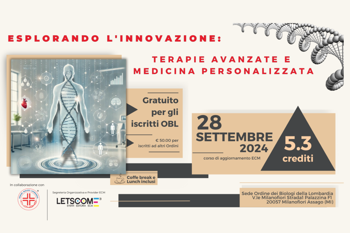“Esplorando l’innovazione: terapie avanzate e medicina personalizzata”: il nuovo corso ECM organizzato dall’Ordine dei Biologi della Lombardia, che già dal titolo si annuncia imperdibile, si terrà il 28 settembre 2024 dalle 8.30 alle ore 16.30 presso la sede operativa OBL, ad Assago (MI).