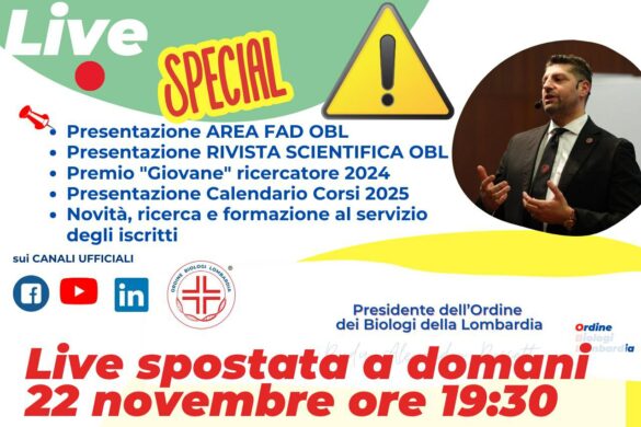 Venerdì 22 novembre, a partire dalle ore 19.30, il Presidente dell’Ordine dei Biologi della Lombardia, il dott. Rudy Alexander Rossetto, terrà una diretta sui canali social istituzionali per presentare le nuove iniziative e i progetti futuri dell’Ordine. La live rappresenta un’importante occasione di dialogo aperto e interattivo con tutti i membri della comunità dei Biologi lombardi.