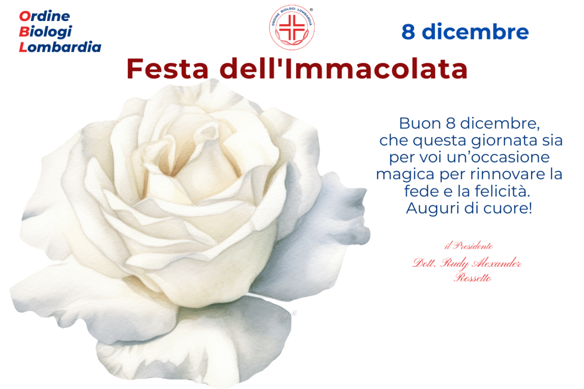 Dal presidente, dott. Rudy Alexander Rossetto, e dal Consiglio direttivo tutto dell’Ordine dei Biologi della Lombardia, l’augurio affinché questa domenica 8 dicembre, giorno dedicato alla Festività dell’Immacolata, possa essere occasione magica per rinnovare la fede e la felicità.
