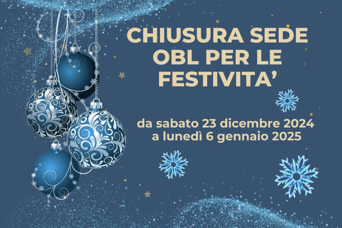 Avviso agli iscritti: la sede dell’Ordine dei Biologi della Lombardia resterà chiusa nei seguenti giorni: dal 21 dicembre al 6 gennaio 2025 (compreso), per le festività.
