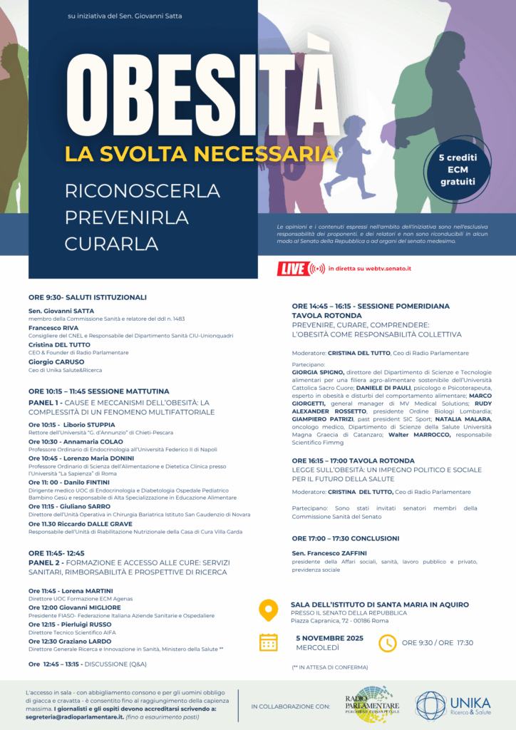 Mercoledì 5 novembre 2025 si terrà il convegno “Obesità: la svolta necessaria. Riconoscerla, prevenirla, curarla”, promosso dal Senatore Giovanni Satta, membro della Commissione Sanità, in collaborazione con Radio Parlamentare e Unika Salute&Ricerca.