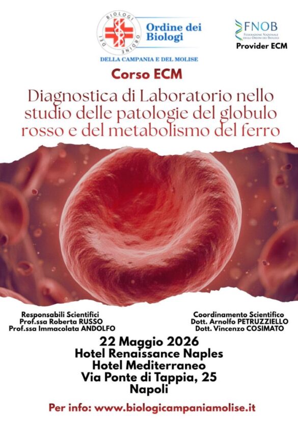 L’Ordine dei Biologi della Campania e del Molise organizza il corso Ecm dal titolo “Diagnostica di laboratorio nello studio delle patologie del globulo rosso e del metabolismo del ferro”.